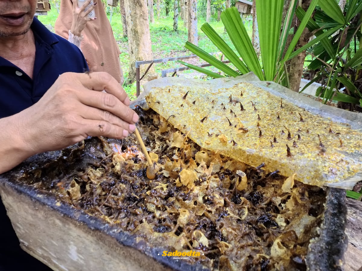 การที่บ้านไหนหนังมีผึ้งโพรงและชันโรงเต็มไปหมดแบบนี้ มันยืนยันได้เลยว่าป่าชายเลนและสวนแถวนี้สะอาดและบริสุทธิ์จริงๆ ชุมชนที่นี่เค้าตกลงกันเลิกใช้สารเคมีทั้งหมู่บ้านเพื่อรักษาบ้านให้ผึ้ง ฟังแล้วรู้สึกเลยว่านี่แหละคือการอนุรักษ์ที่กินใจและยั่งยืนที่สุด